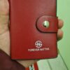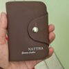 Metal button closure keeps cards and cash safe.